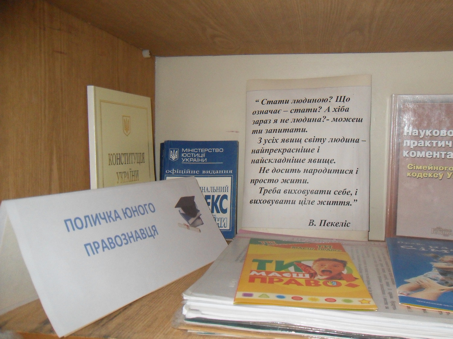 - Створення у бібліотеці ліцею полички юного правознавця (правової літератури для користування учнів) та виставка щодо пропаганди здорового способу життя на тему: «Друг ти собі, чи ворог?» (бібліотекар Марсакова І. В.).